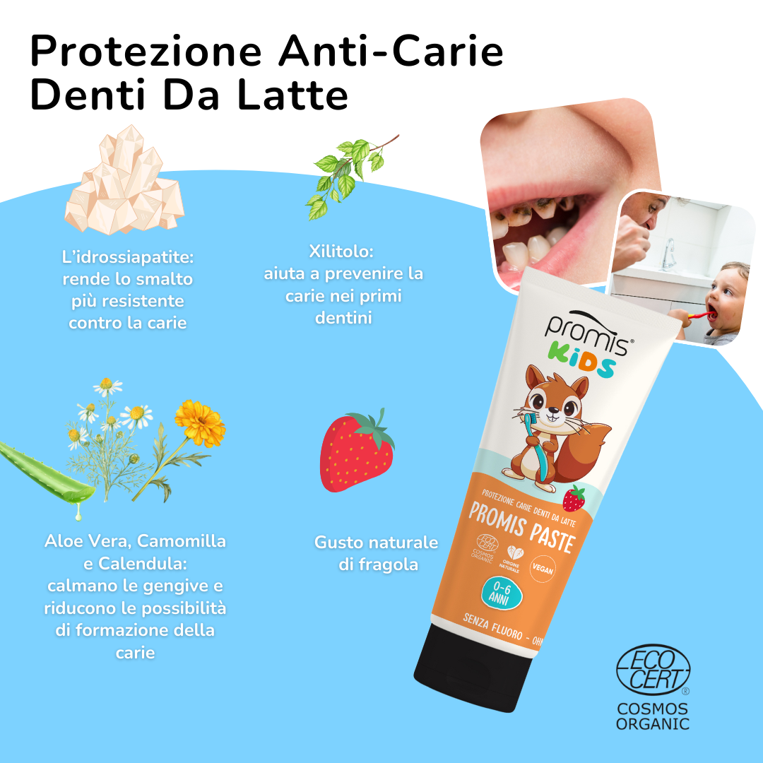 promis paste kids | protezione carie denti da latte senza fluoro | 0 - 6 anni